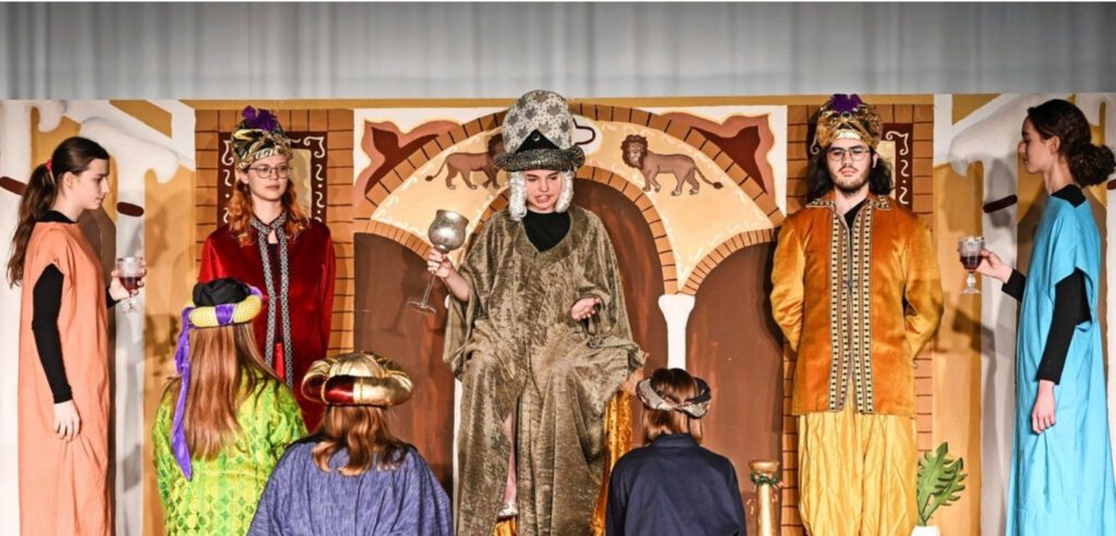 Das Stück endete mit dem Lied „Everywhere“, das dann nicht nur vom Chor, sondern von allen Anwesenden gesungen wurde, während die Akteure mit Kerzen durch die Aula auf die Bühne gingen. Das Stück war nicht nur spannend, sondern entlockte den Zuschauern auch das eine oder andere Lachen. Insbesondere der Auftritt des Herodes sorgte für viel Gelächter im Publikum. Auch die kleine Panne, als der persische König versehentlich den Wein auf seinen Diener schüttete, war sehr belustigend.