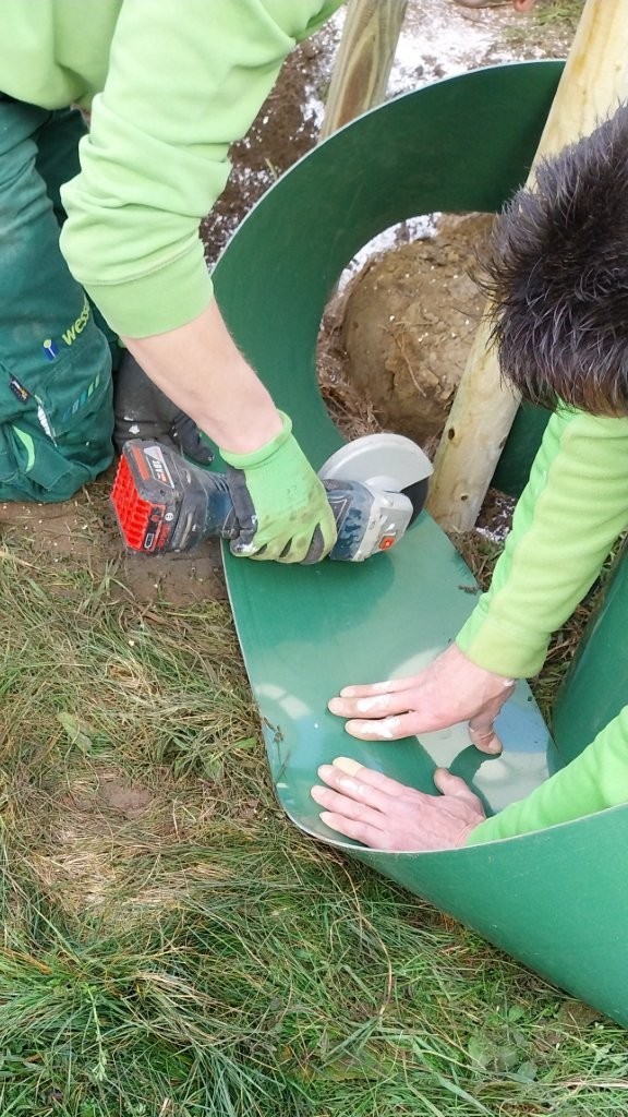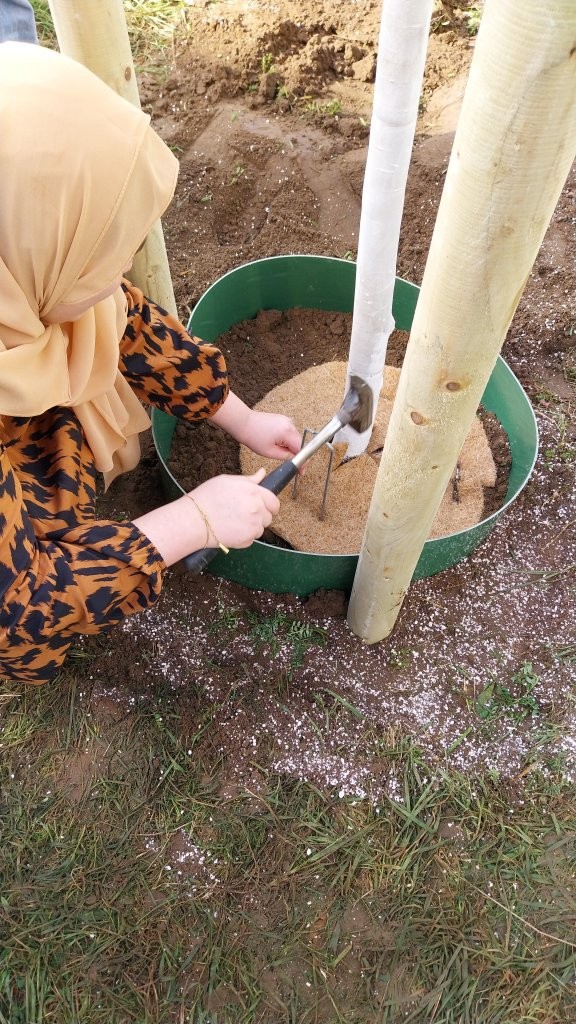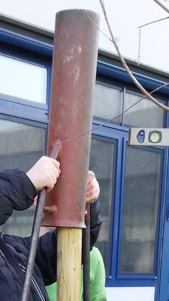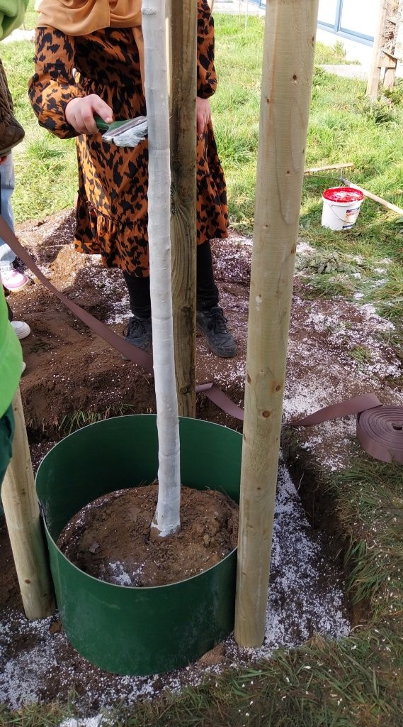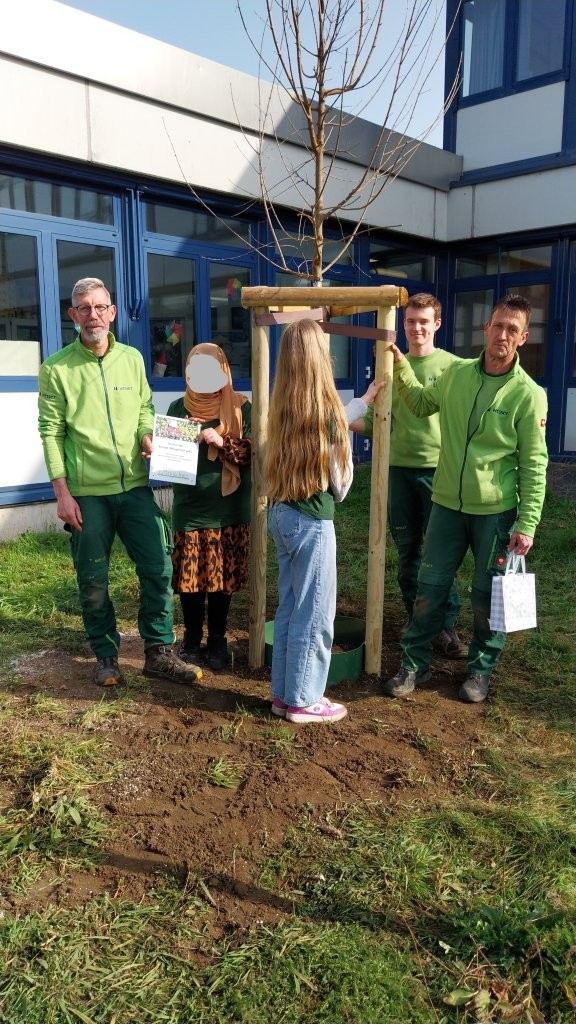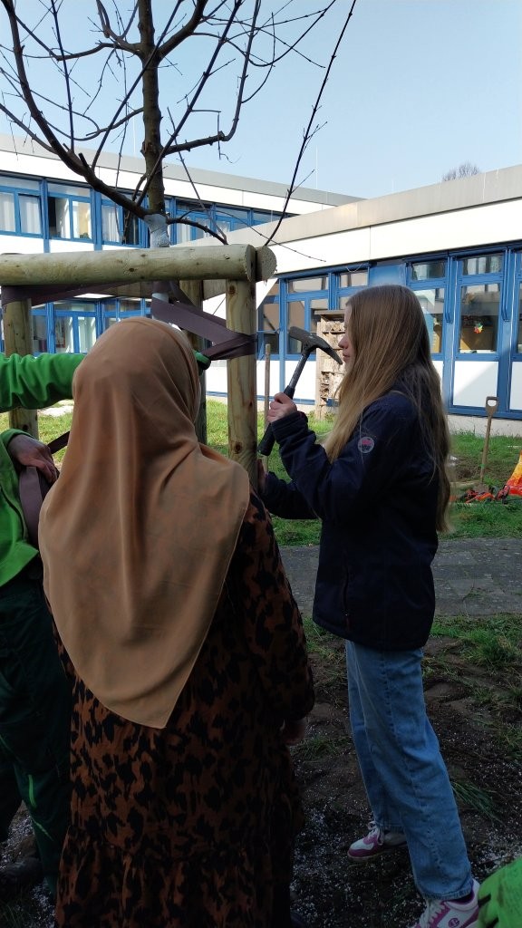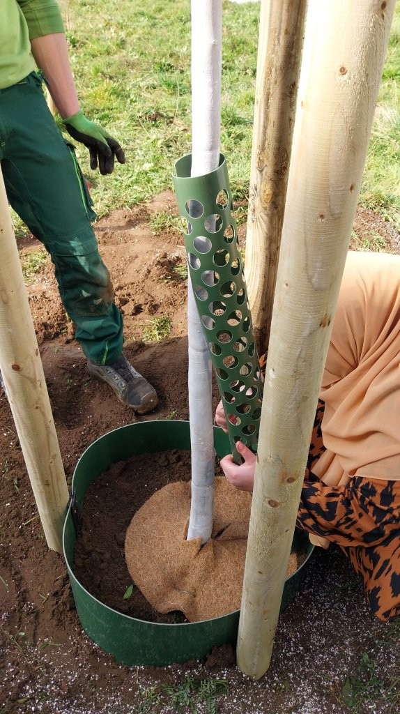 Unter der kundigen Anleitung der drei Fachleute lernten die Jugendlichen Schritt für Schritt, wie man einen Baum sicher und fachgerecht pflanzt – und durften dabei überall selbst mit anpacken: vom Vorbereiten des Pflanzlochs mit wasserspeicherndem Material, dem Setzen und vorsichtigen Aufschneiden der Wurzelballen, dem exakten Platzieren der drei Holzpfähle und Umranden des späteren Gießbereiches, über das Auflegen der Wurzelschutzmatte und das sorgfältige Auffüllen mit Erde, bis hin zum Anbringen des Sonnenschutzes am Stamm, dem Anlegen der Stammschutzmanschette und dem fachgerechten, wind- und wettersicheren Fixieren der Pfähle.
