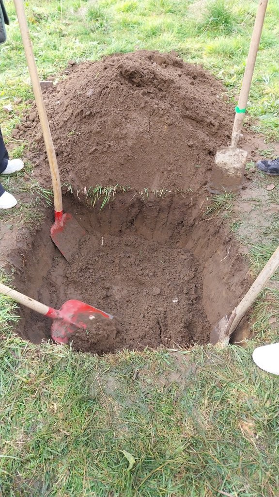 Das Ausheben der Pflanzlöcher erfolgte vollständig von Hand – mit Spaten und Schaufeln. Die Gruppe staunte, wie routiniert die Profis ein Loch nach dem anderen vorbereiteten, während die Jugendlichen gemeinsam gerade erst ihr erstes Drittel geschafft hatten. Ein eindrucksvoller Einblick in echte Profiarbeit! 😊