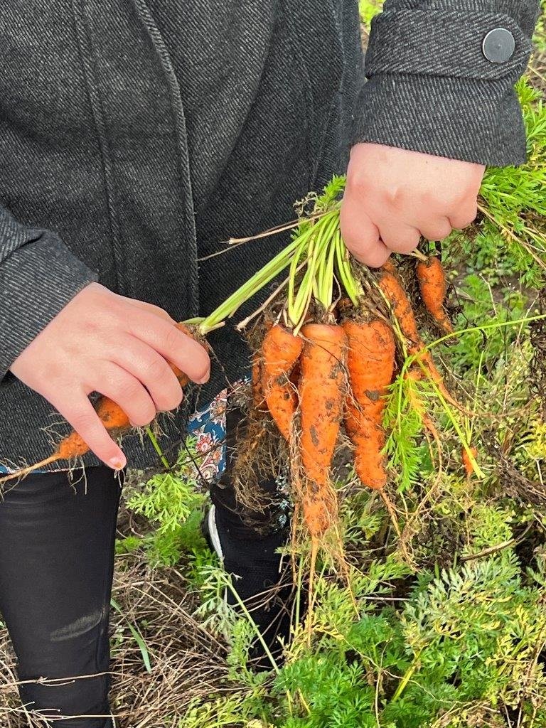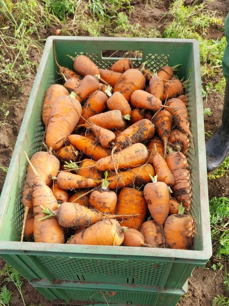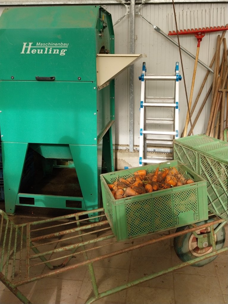 Die erste praktische Aufgabe wartete bereits: Oxhella-Möhren ausmachen (ernten)! Mit der Grabegabel lockerten die Jugendlichen die Erde, zogen das Wurzelgemüse am Schopf heraus, schüttelten die Erde ab und knickten das Kraut ab. Die vollen Erntekisten wurden anschließend ins Gewächshaus transportiert. Dort staunte die Gruppe nicht schlecht über eine besondere Maschine: eine Waschanlage für Gemüse. Josef Koplin erklärte schmunzelnd, wie sie funktioniert – und die Jugendlichen durften es sofort selbst ausprobieren. Erdverklumpte Möhren gingen auf der einen Seite rein, blitzblank geschrubbt kamen sie auf der anderen wieder heraus. Doch damit nicht genug: Aus den frisch geernteten Möhren wurde vor Ort leckerer Möhrensaft gepresst, der (fast) allen hervorragend mundete.