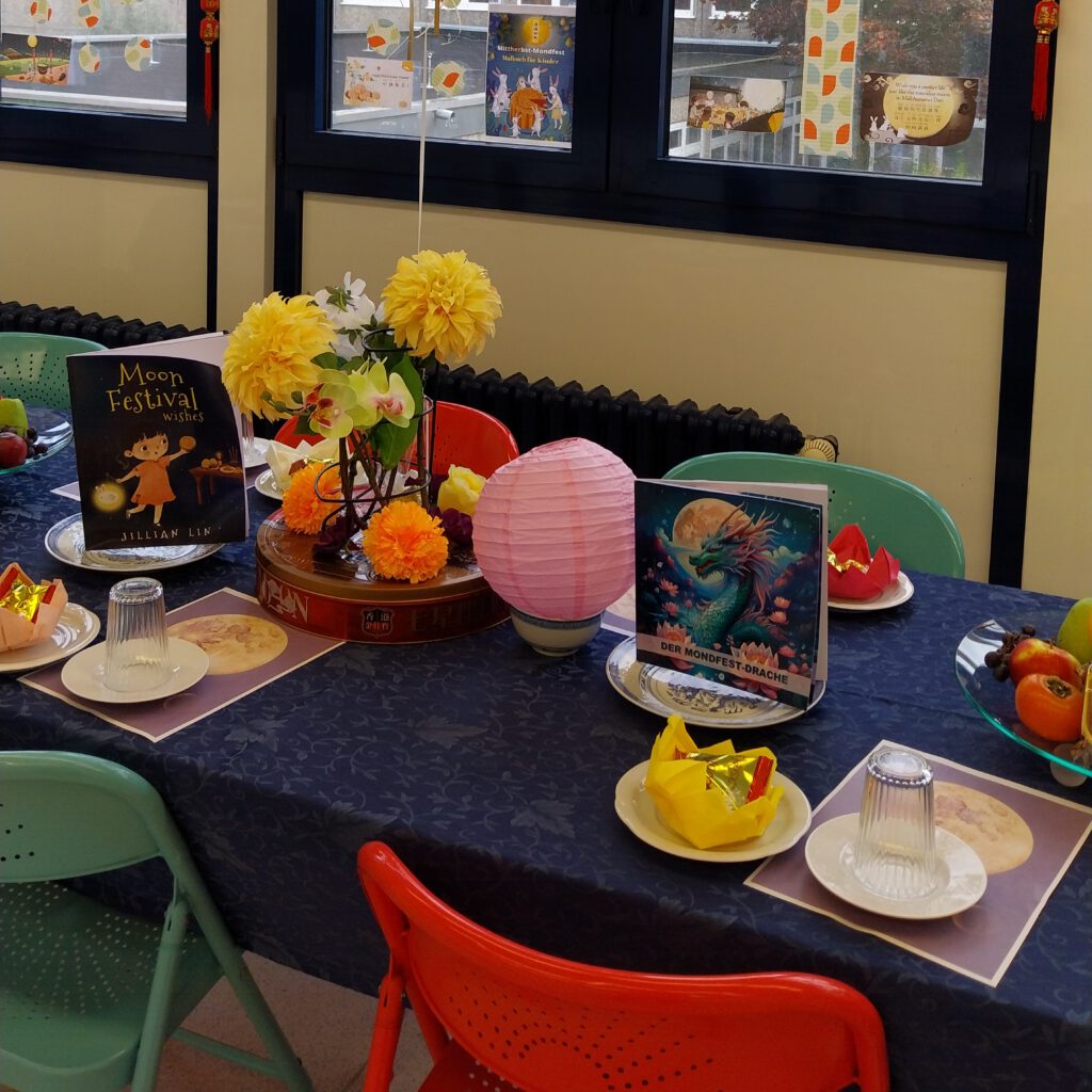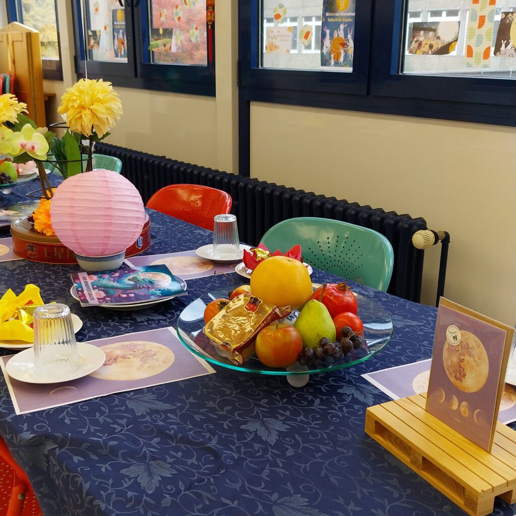 Eine Woche später war es dann so weit: Der Tisch war liebevoll dekoriert mit Herbstfrüchten, u.a. mondgleichen ‚Pomelos‘, den Mondkuchen-Geschenkpackungen, Lotusblüten-Servietten, Grußkarten und zauberhaften Mondbildern. Der Jadehase/ Mondhase durfte natürlich nicht fehlen. Zum Highlight wurden die selbst zubereiteten, herzhaft gefüllten Mondkuchen nach chinesischem Rezept – begleitet von prickelndem Apfel-Quitten-Saft statt Osmanthus-Tee. Beim Vorlesen der Legende von Mondgöttin Chang’e wurde es richtig magisch…